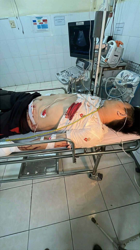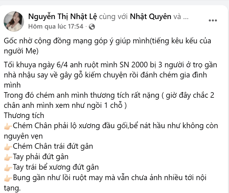 Thấy con trai bị tấn công, mẹ của anh P.T. chạy vào can ngăn cũng bị nhóm này đánh, gây thương tích ở chân phải.