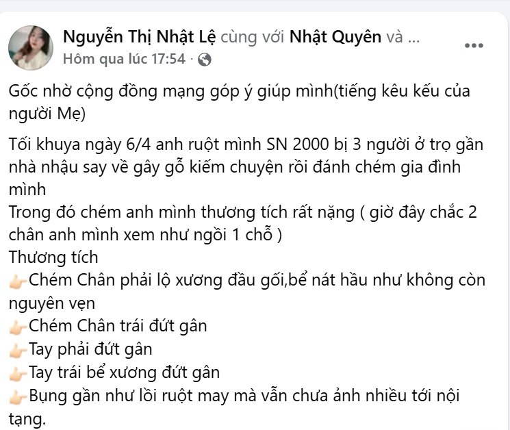 Trong lúc can ngăn, mẹ của anh P.T. cũng bị nhóm đối tượng tấn công, dẫn đến bị thương ở chân phải.