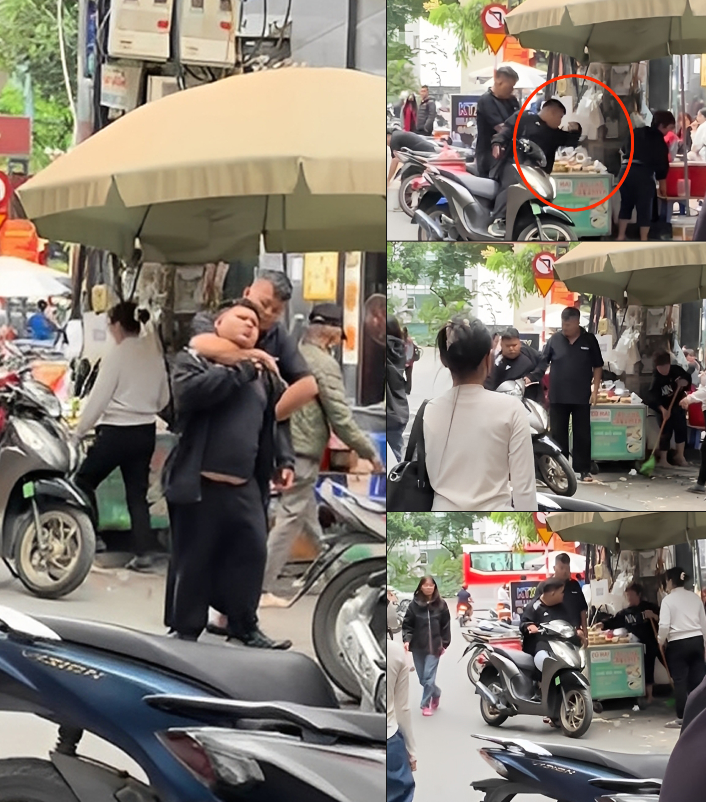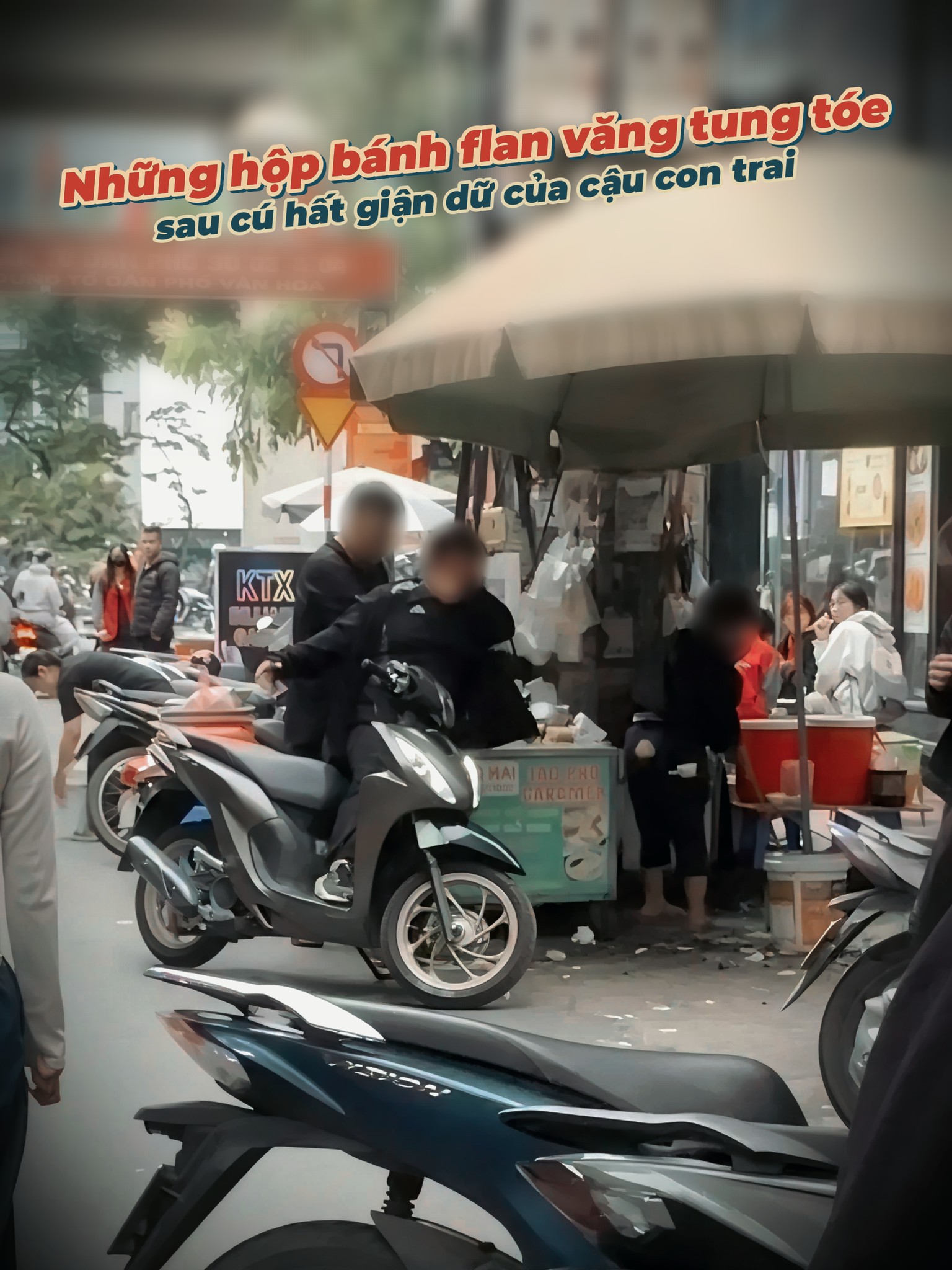 Chỉ ít giây sau, cậu con bất ngờ hất mạnh cả khay hàng xuống đất. Những hộp flan nhỏ xíu lăn lóc khắp mặt đường, xô dầu hũ văng tung tóe.