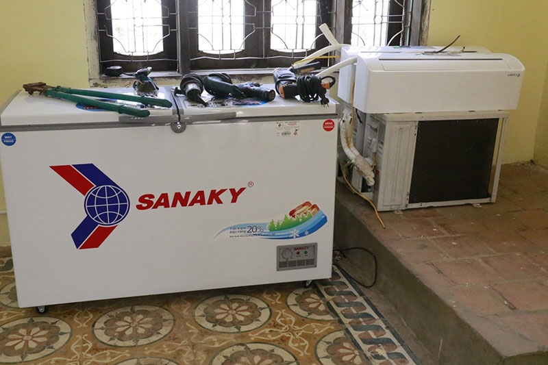 Tài sản sau khi trộm được các đối tượng đưa sang xã khác để cất giấu nhằm đối phó với cơ quan Công an. Tang vật thu giữ: 2 thuyền, 2 bộ điều hòa, 2 tủ lạnh, 1 máy gặt cùng nhiều tài sản khác với tổng giá trị trên 100 triệu đồng.