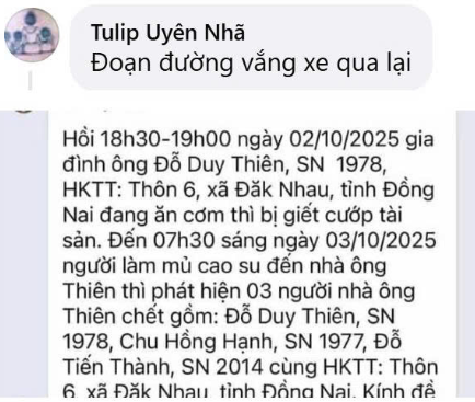 Lực lượng công an đang phong tỏa nghiêm ngặt hiện trường vụ ba người trong một gia đình tử vong để điều tra làm rõ.Đến trưa ngày 3-10, Công xã xã Đak Nhau và các đơn vị nghiệp vụ Công an tỉnh Đồng Nai điều tra làm rõ vụ việc phát hiện ba thi thể trong một ngôi nhà.Ba nạn nhân được xác định là: ông Đỗ Duy T (47 tuổi, chồng), bà Chu Hồng H (46 tuổi, vợ) và cháu trai Đỗ Tiến T (11 tuổi).Hiện tại, lực lượng công an đang phong tỏa hiện trường để khám nghiệm. Rất nhiều người dân tập trung xung quanh khu vực này để theo dõi.Lãnh đạo UBND xã Đak Nhau xác nhận vụ việc được phát hiện sáng nay tại một ngôi nhà trên địa bàn. Người chồng và con trai được phát hiện tử vong ở khu vực hiên nhà. Còn người vợ được phát hiện trong phòng ngủ.Bước đầu phát hiện ba nạn nhân có thương tích. Trong nhà, két sắt có dấu hiệu bị lục lọi. Được biết, gia đình nạn nhân làm nghề thu mua nông sản.Lưu ý: Thông tin chưa được chứng thực, mọi người xem tham khảo. Đợi thông tin chính thức từ CQCN nha