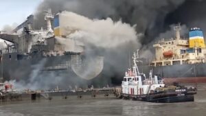 Tàu chở dầu bốc cháy ngùn ngụt khi đang neo đậu để sửa chữa.