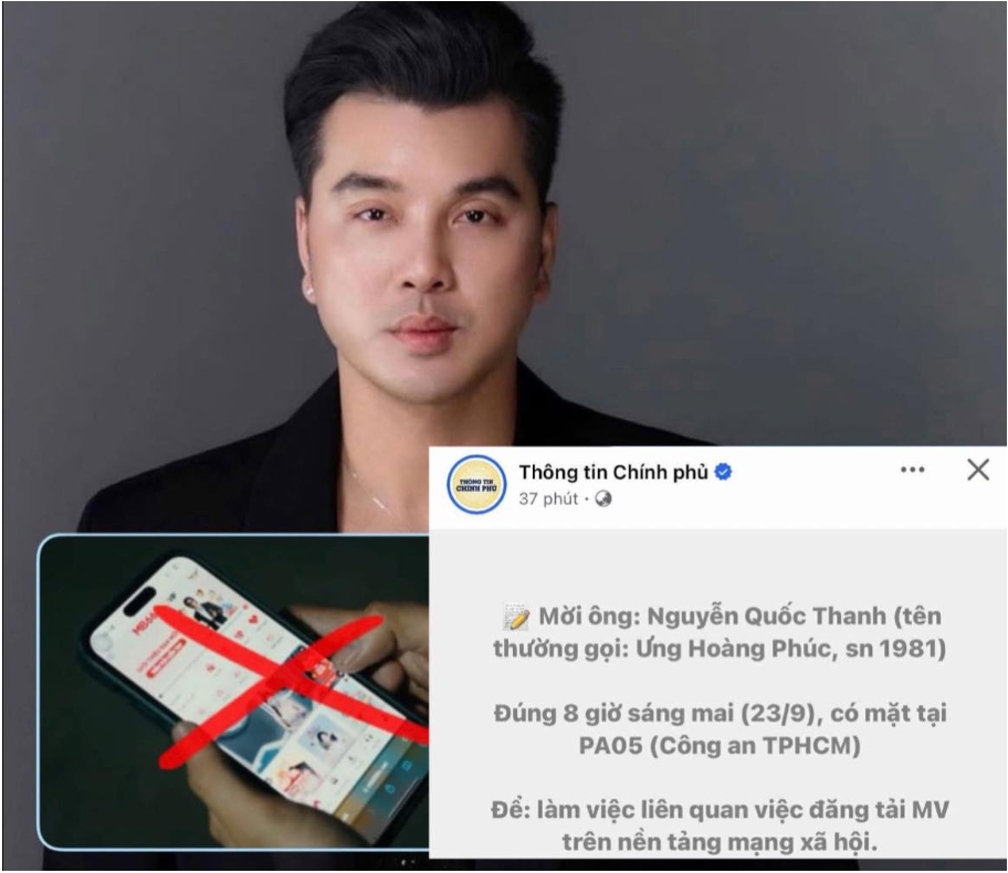 Chiều 21/9, mạng xã hội xuất hiện thông tin Ưng Hoàng Phúc đã được mời lên làm việc sau những ồn ào liên quan đến MV “Anh em trước sau như một”. Theo đó, nhiều người chia sẻ ảnh chụp một tờ giấy mời được cho là của Phòng an ninh mạng và phòng chống tội phạm sử dụng công nghệ cao, Công an TP.HCM gửi cho Nguyễn Quốc Thanh (tên thật của Ưng Hoàng Phúc), để làm việc về việc đăng tải MV trên nền tảng mạng xã hội.