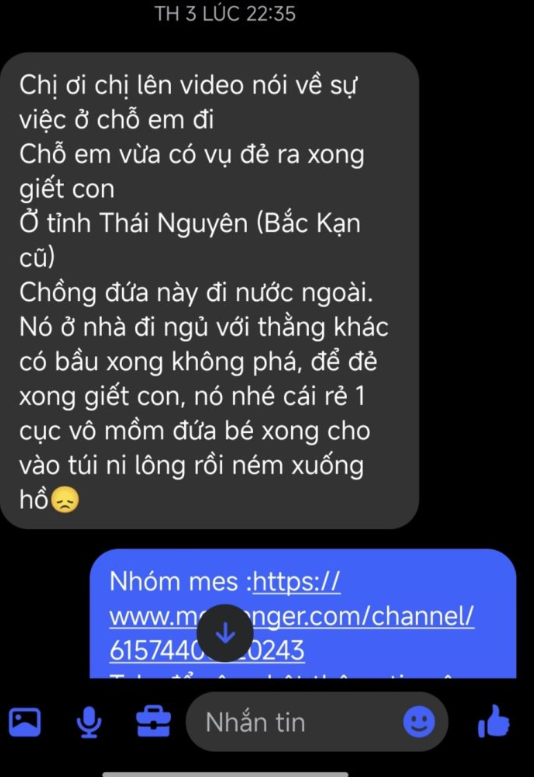 Ngoài ra còn có thông tin của người dân địa phương cho biết thủ phạm là người đã có chồng, chồng đi nước ngoài làm việc, ở nhà vụng trộm với người yêu thì có thai ngoài ý muốn nên mới hành xử